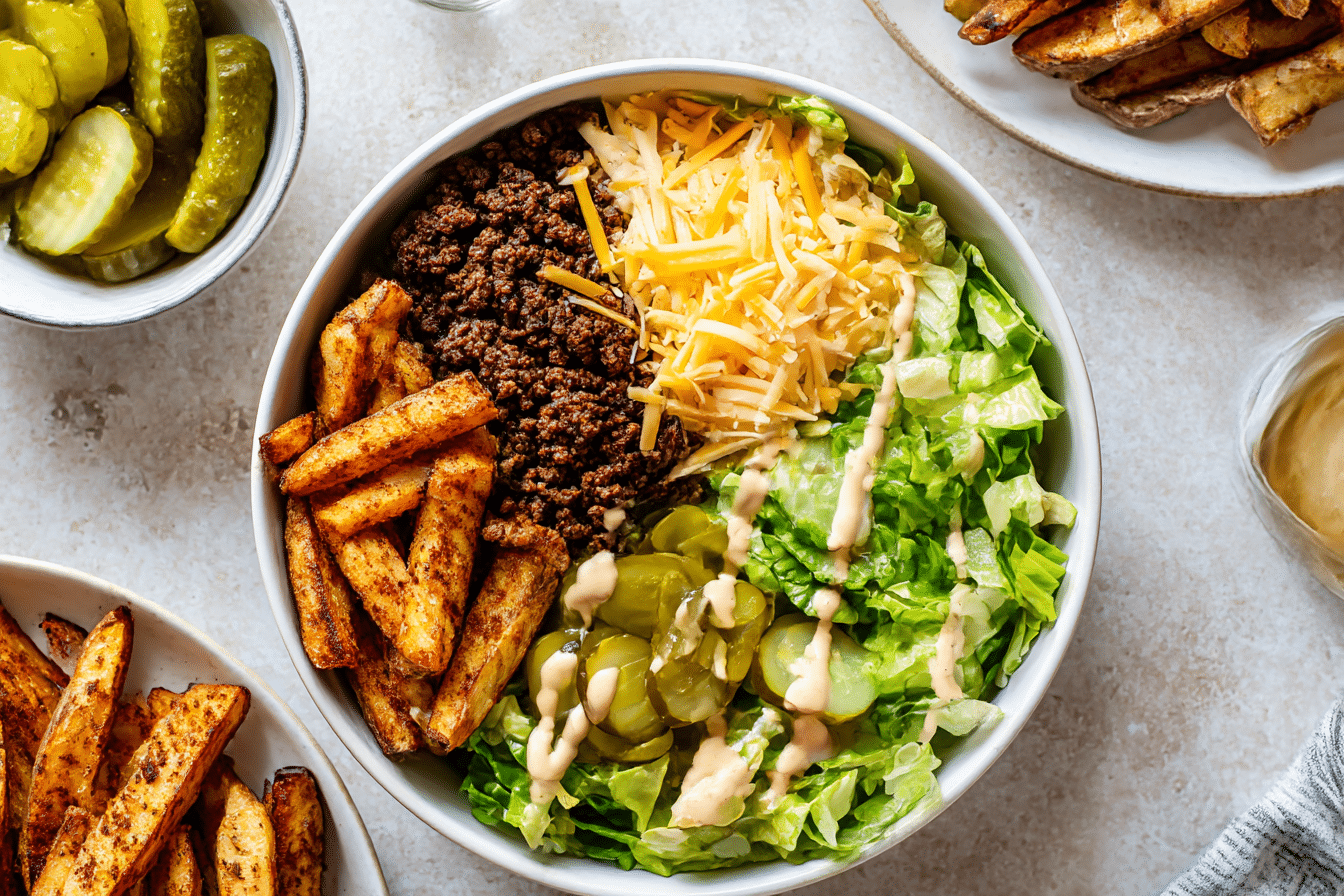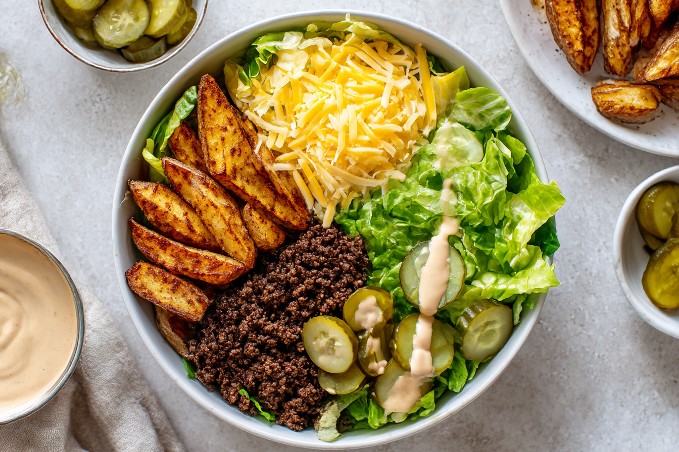 Ground beef forms the protein base of the bowl. It delivers the classic burger flavor and cooks quickly in a skillet. Lean ground beef works well for a lighter option, while higher-fat blends produce richer flavor.