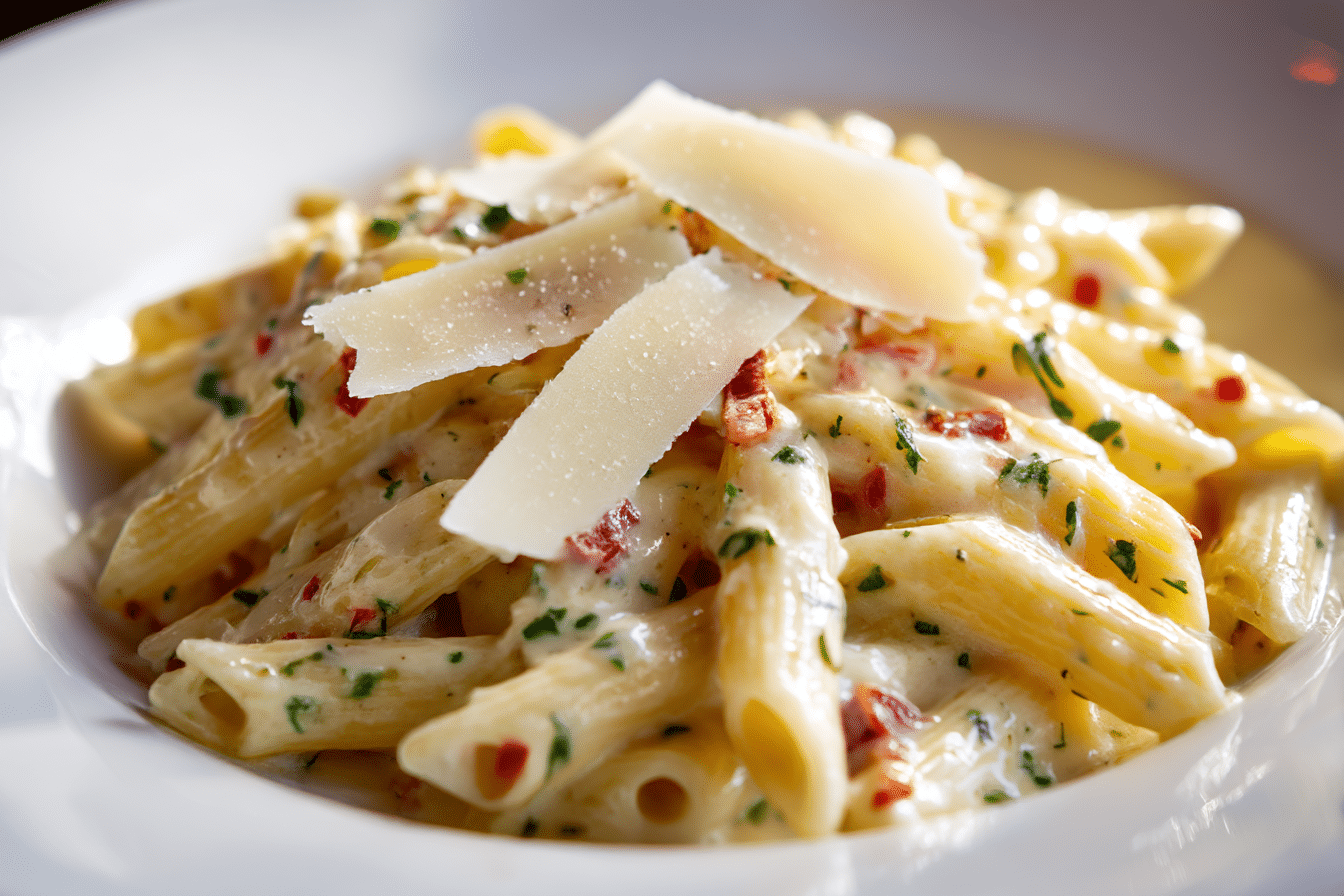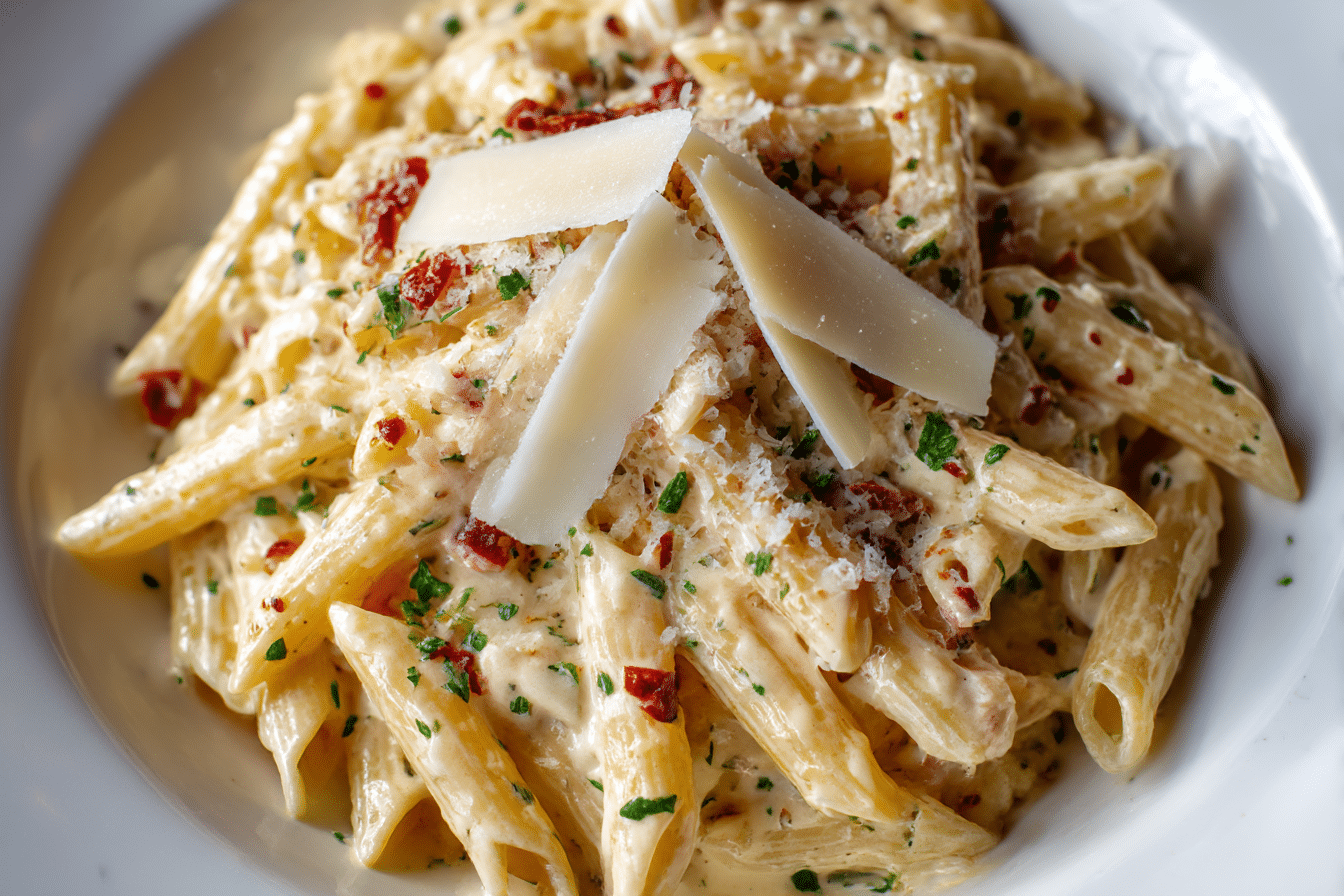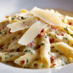 Pasta serves as the base of the dish. Short pasta shapes like penne, fusilli, or farfalle work best because they hold the creamy sauce well. Cooking pasta directly in the sauce allows the starches to thicken it naturally, creating a luscious coating.