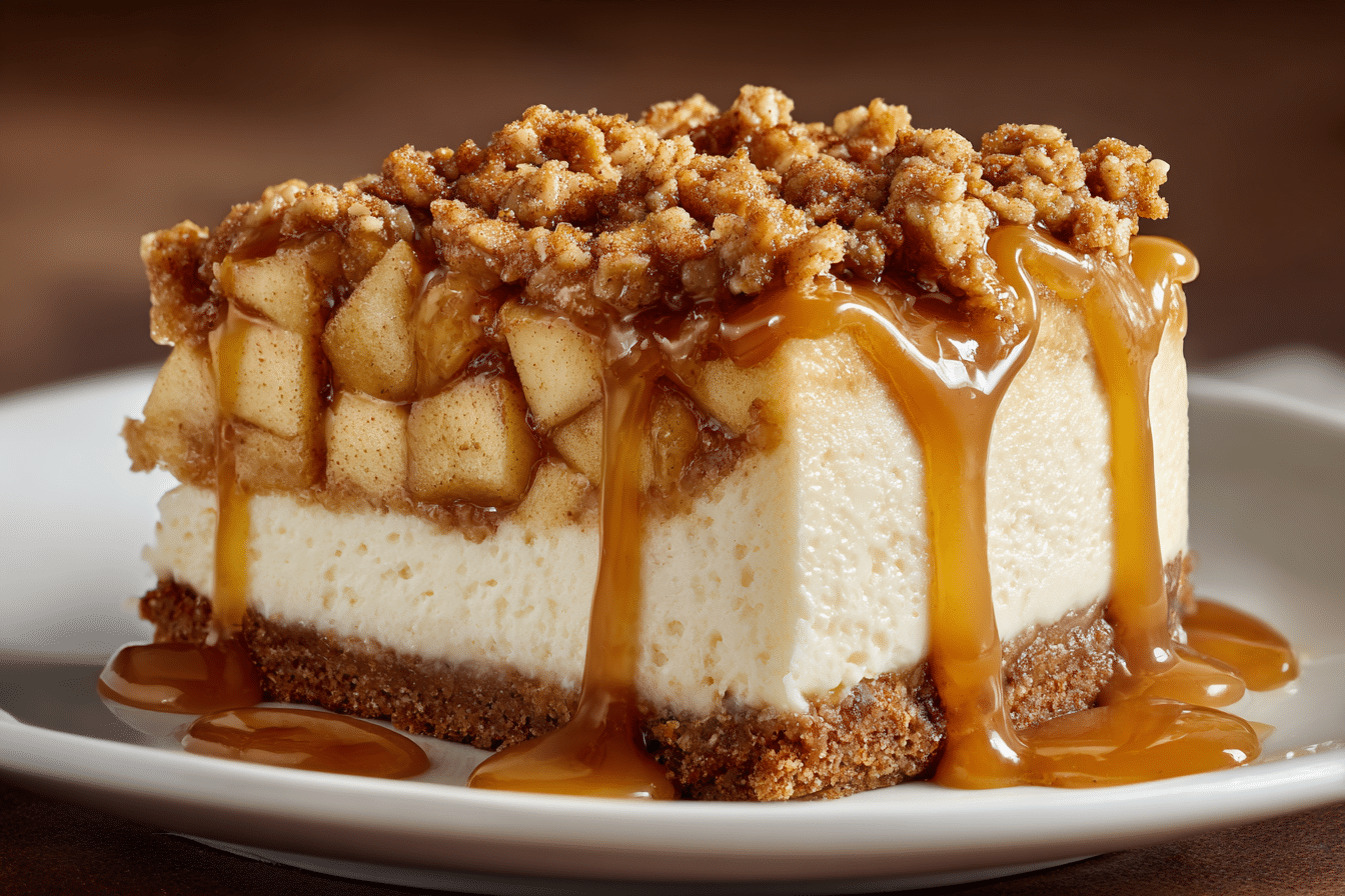 Creamy cheesecake layered with spiced apples and a cinnamon oat crisp topping — the ultimate fall dessert combining apple crisp and cheesecake in one luscious bite.