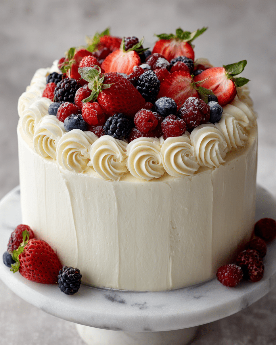 A soft vanilla cake layered with whipped mascarpone cream and fresh berries. This light and elegant dessert is perfect for spring and summer celebrations.