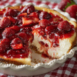 Few desserts are as simple — or as delicious — as a Strawberry Cheesecake Dump Cake. This cozy, crowd-pleasing treat layers sweet strawberry pie filling with a rich, tangy cream cheese mixture and buttery cake topping for a warm, gooey dessert that tastes like a cross between cobbler and cheesecake.
