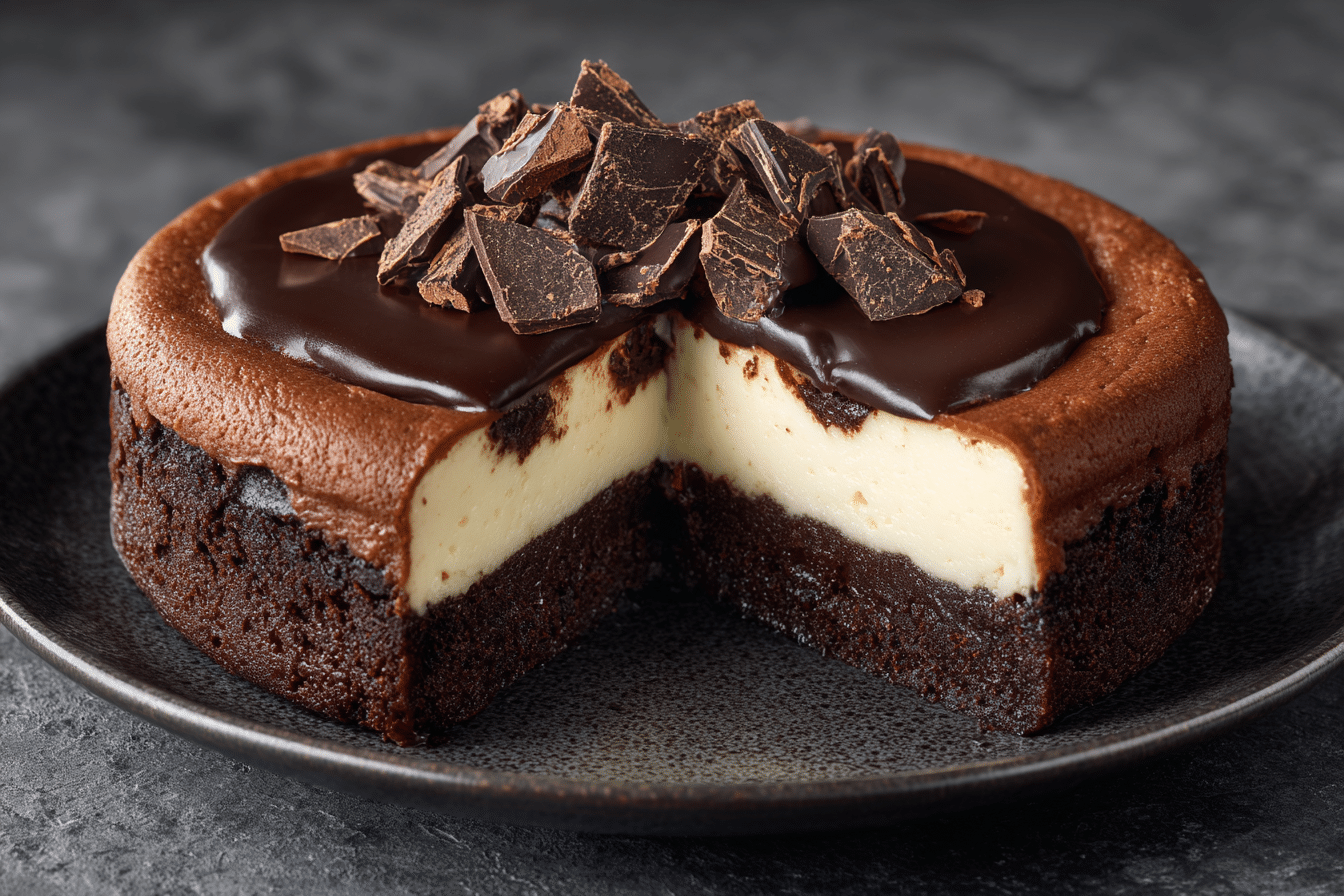 A layered birthday cake with a rich, fudgy brownie base and a creamy vanilla cheesecake topping, finished with a chocolate ganache glaze. The perfect make-ahead celebration dessert.