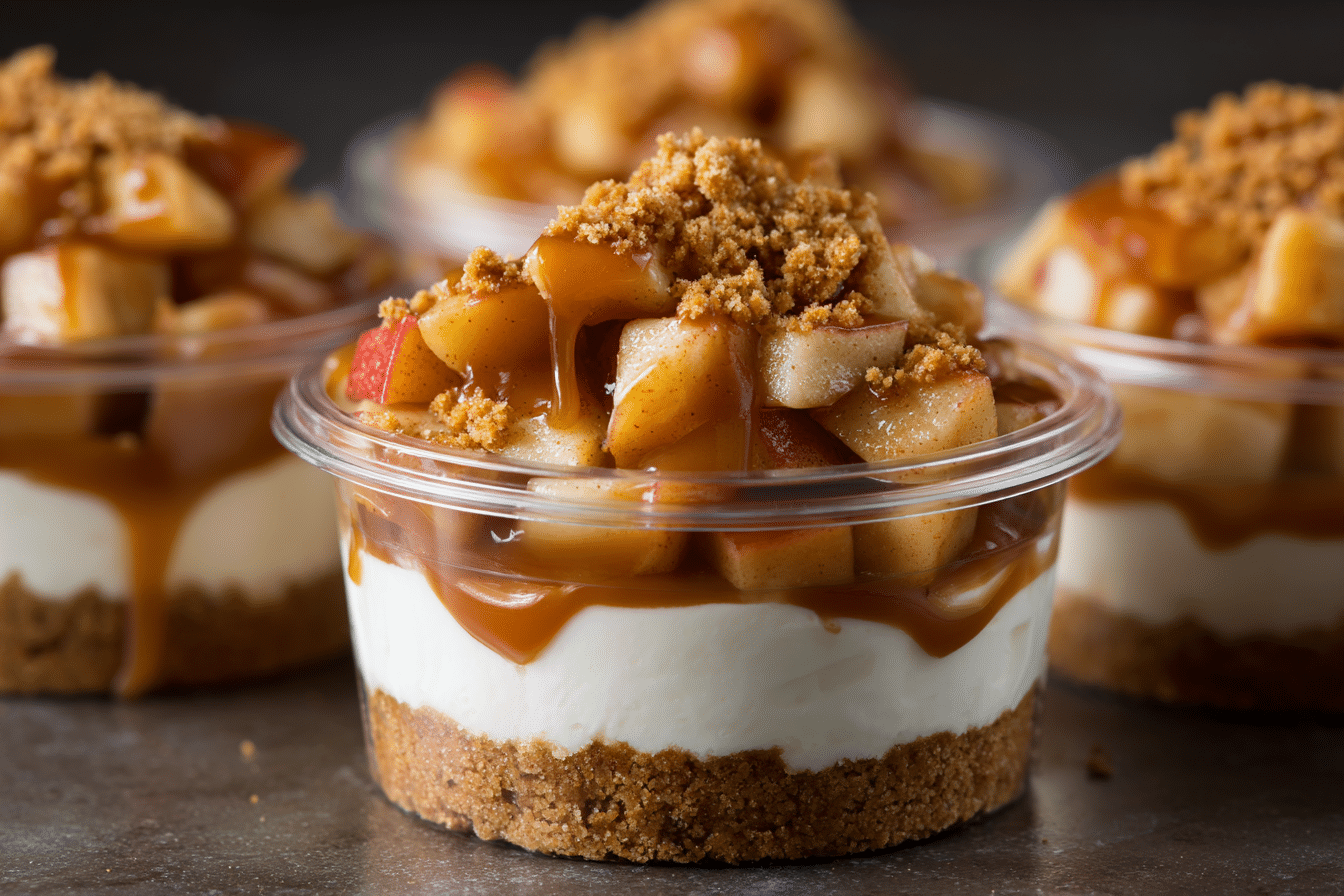 Individual dessert cups layered with graham cracker crust, warm cinnamon apples, creamy filling, and caramel drizzle. A fall favorite for any occasion.
