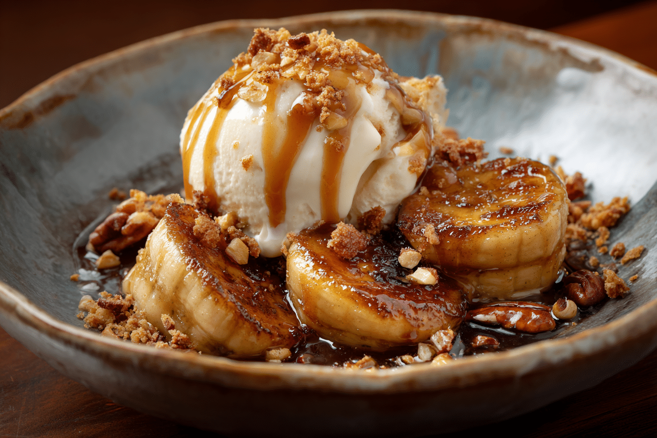 A warm, caramel-coated dessert featuring sweet bananas, toasted pecans, and buttery brown sugar sauce with a splash of rum—perfect over ice cream or pancakes.