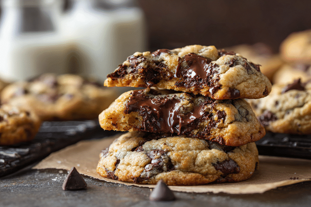 These ultra-thick bakery-style chocolate chip cookies deliver everything cookie lovers crave: crisp golden edges, molten gooey centers, and generous pools of melted chocolate. Inspired by the oversized cookies from boutique …