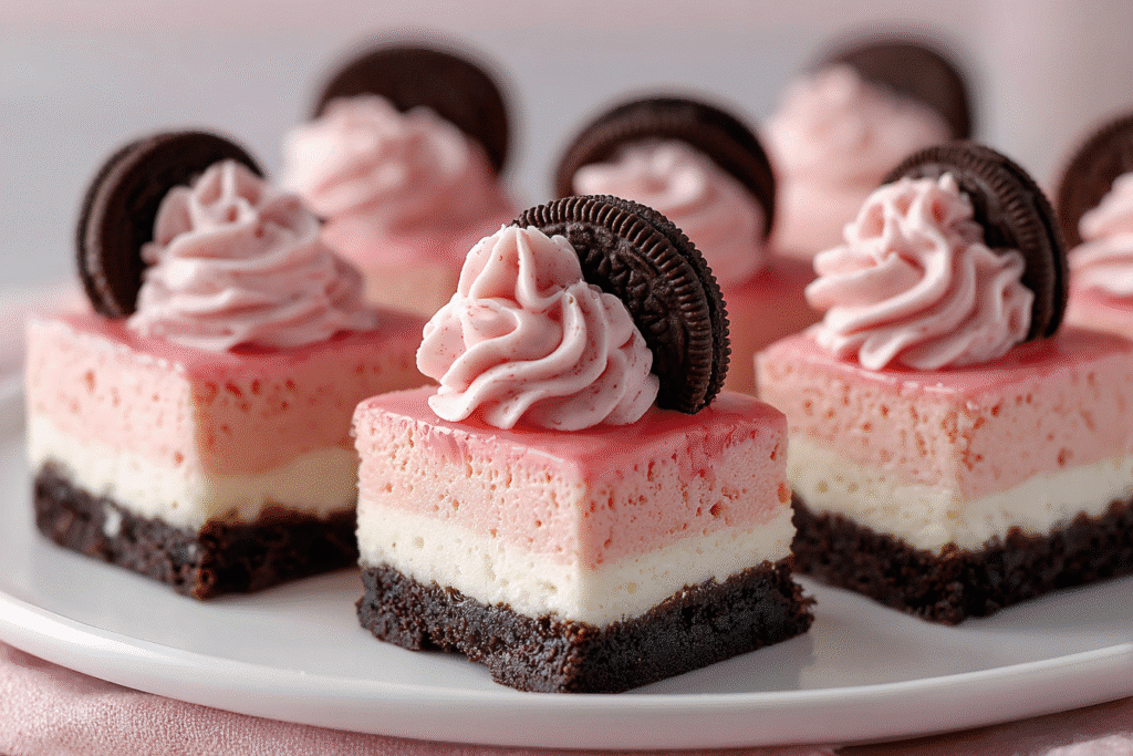 There’s something undeniably charming about the vibrant contrast of pink cheesecake and dark Oreo crust. These Pink Oreo Cheesecake Squares blend the playful color of strawberry-flavored cream with the rich …