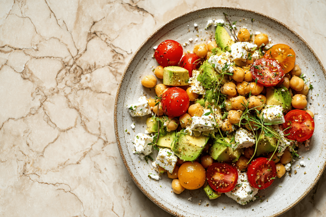 Chickpea Feta Avocado Salad offers a balance of plant-based protein, healthy fats, and fiber. Chickpeas provide steady energy through complex carbohydrates and protein content.