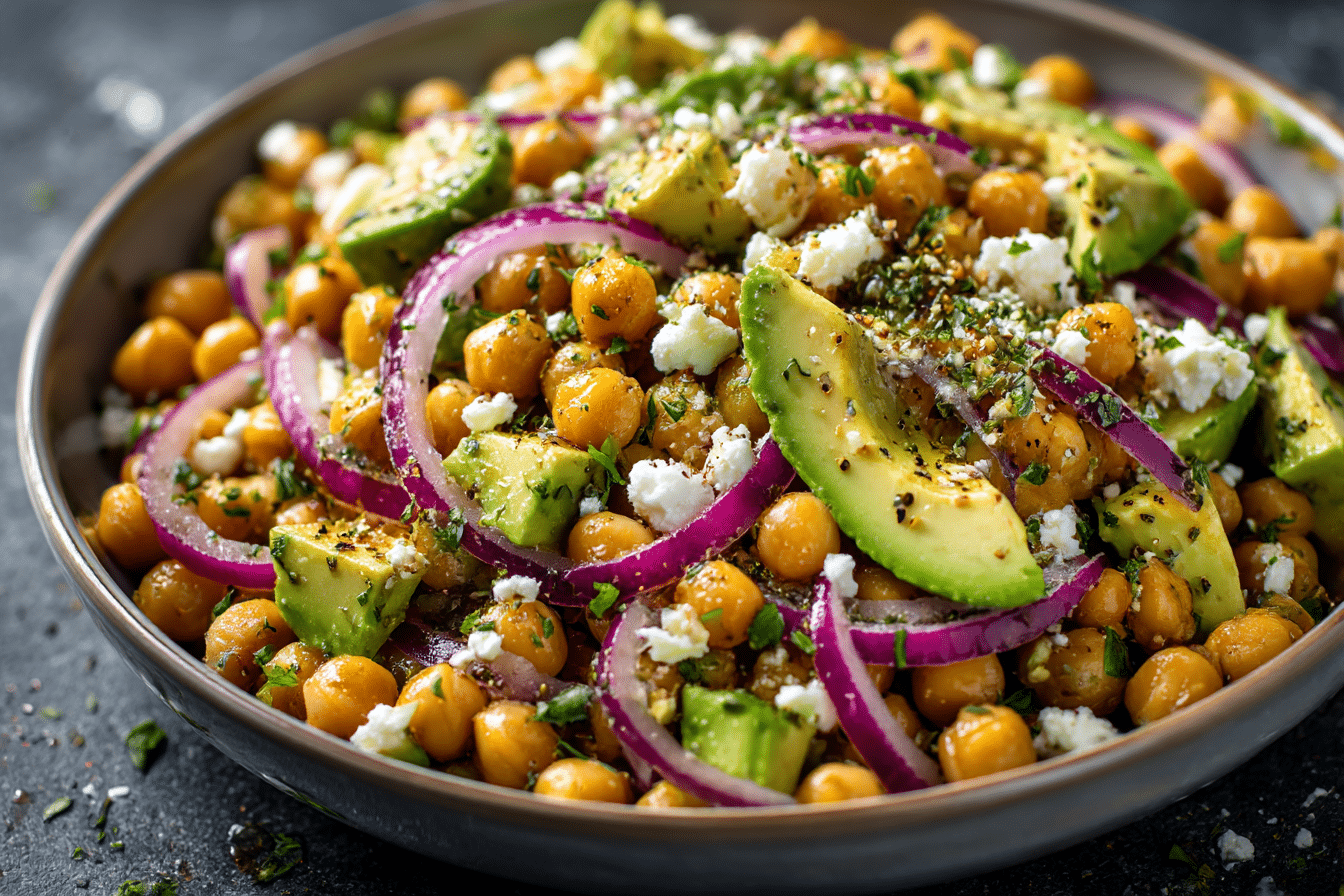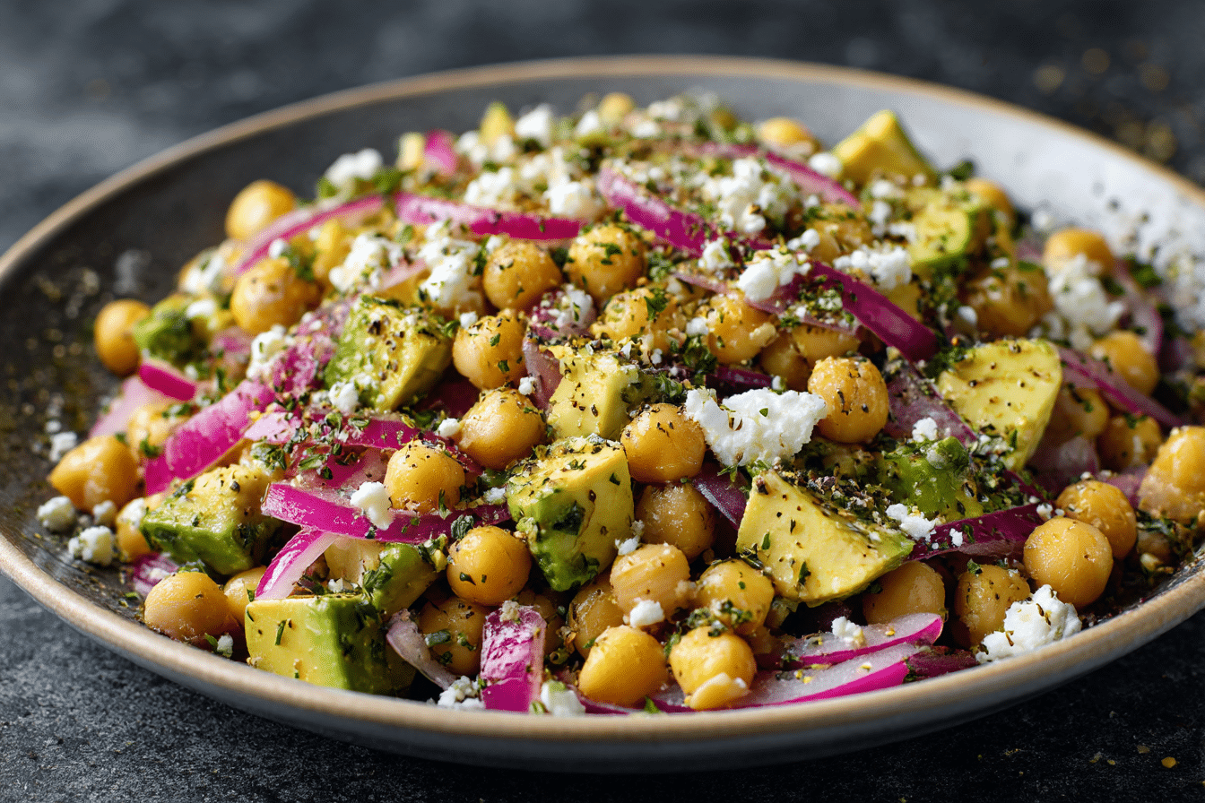 Creamy avocado balances the firm texture of chickpeas, while feta adds a salty contrast that makes the entire salad pop. Fresh herbs and crisp vegetables complete the dish, creating layers of texture and flavor.