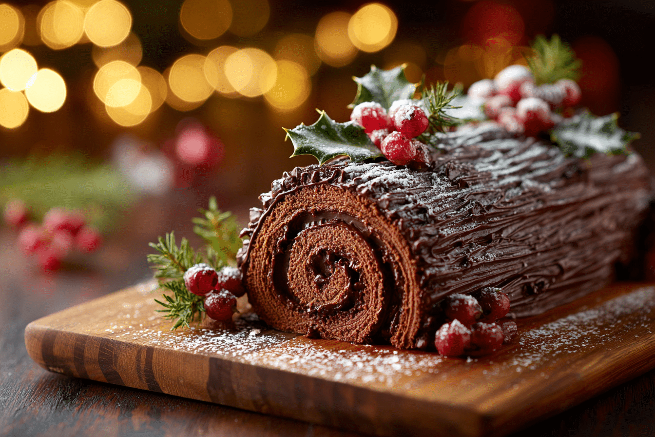 A festive rolled chocolate sponge cake filled with whipped cream and covered in rich ganache, styled to resemble a rustic Yule log. A classic Christmas dessert centerpiece.