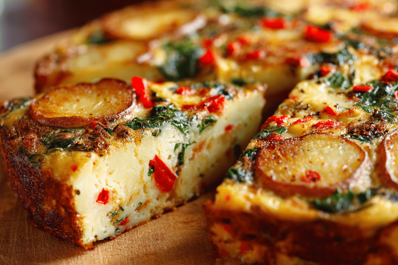 The appeal of this frittata lies in its combination of textures and flavors. Soft potatoes provide substance, roasted red peppers bring natural sweetness, and spinach contributes a bright, earthy note. Eggs hold everything together, creating a fluffy, tender structure that makes this dish both comforting and visually appealing. It’s easy to make, versatile, and ideal for anyone looking for a nutritious, flavorful meal with minimal effort.