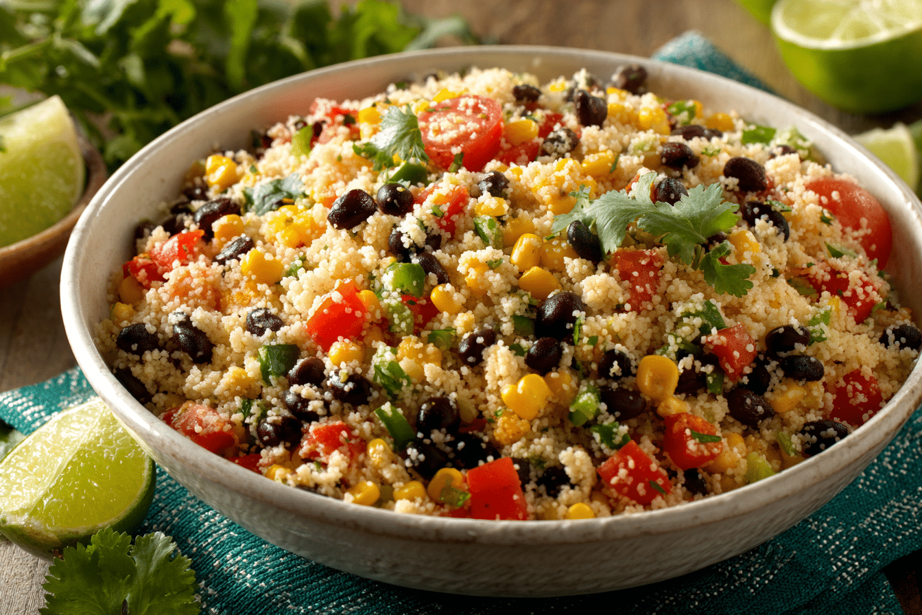 This salad provides a nutrient-rich, balanced meal. Couscous supplies complex carbohydrates, while black beans add protein and fiber. Corn, cherry tomatoes, and bell peppers provide vitamins A, C, and K, as well as antioxidants. Avocado contributes healthy fats, and pumpkin seeds add magnesium and zinc.