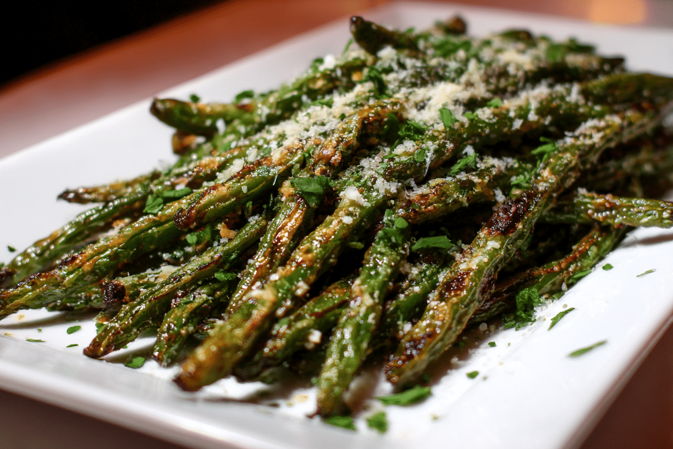 Crispy roasted green beans tossed with garlic and Parmesan, garnished with parsley for a flavorful, easy side dish.