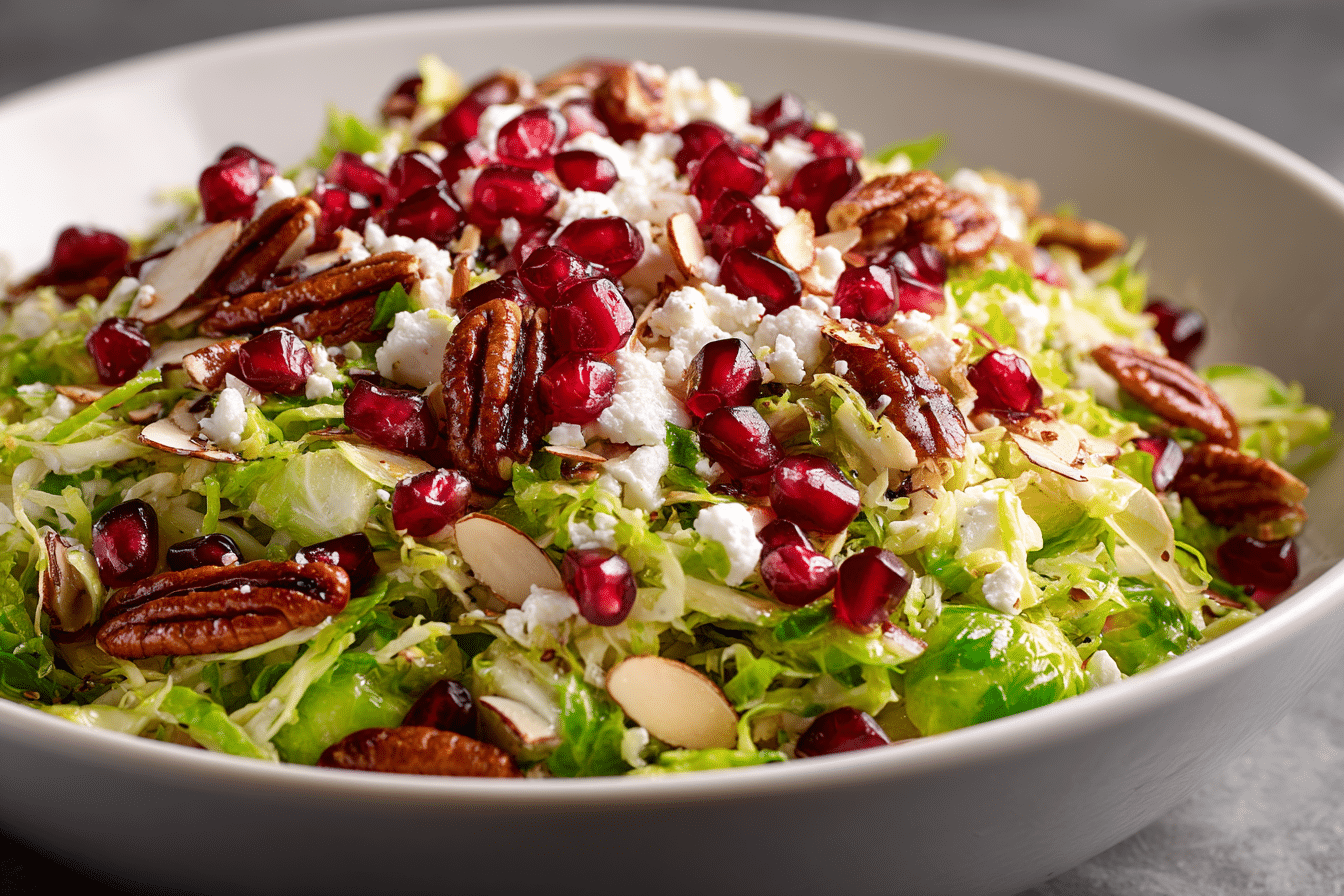 A vibrant winter salad with shaved Brussels sprouts, juicy pomegranate seeds, crunchy candied pecans, and a maple-Dijon vinaigrette. Fresh, colorful, and perfect for holidays or everyday meals.