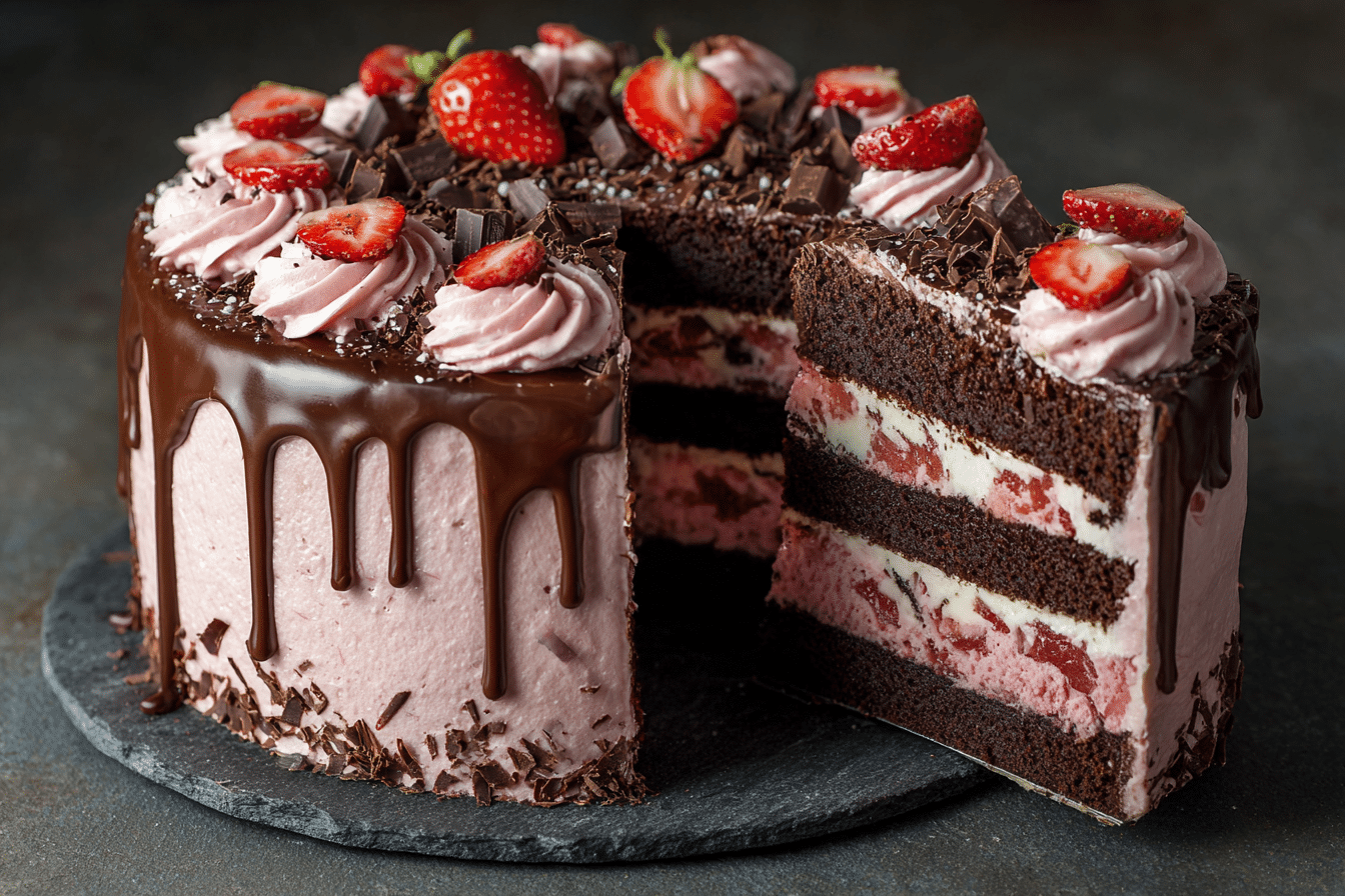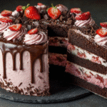 This cake is perfect for special occasions, romantic dinners, or simply when you’re in the mood for something a little indulgent. Moist layers of chocolate cake are filled and topped with luscious strawberry frosting, real sliced berries, and a velvety ganache drizzle. It’s a feast for the senses — the aroma of cocoa, the slight tartness of strawberries, the soft crumb of cake, and the melt-in-your-mouth ganache all working together beautifully.