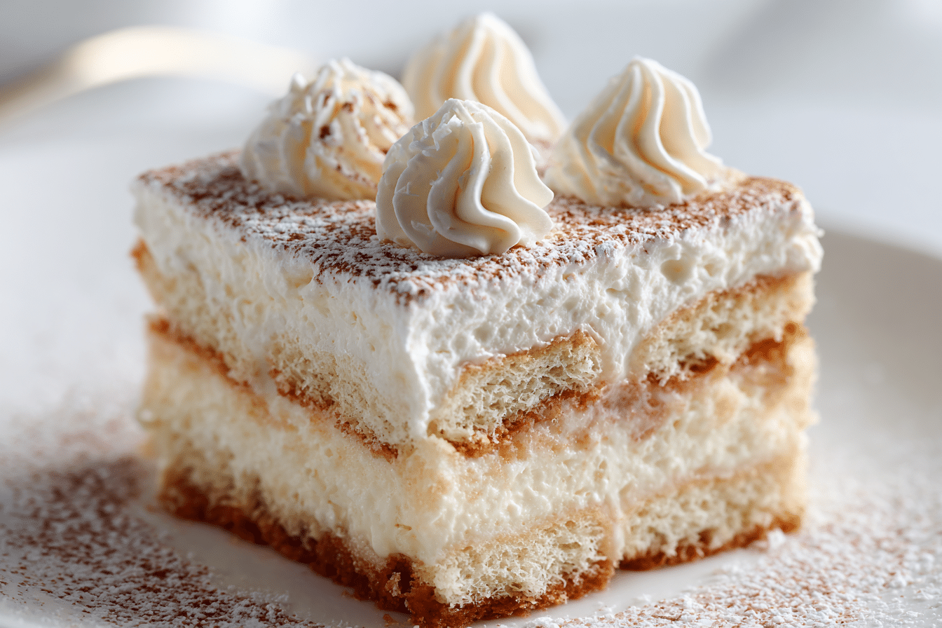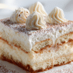 Instead of espresso and cocoa, this version layers soft ladyfingers with a light coconut cream, a hint of almond, and fluffy mascarpone filling. It’s cool, fragrant, and rich without being heavy. Whether served for the holidays, summer gatherings, or after a dinner party, this coconut tiramisu will steal the spotlight.