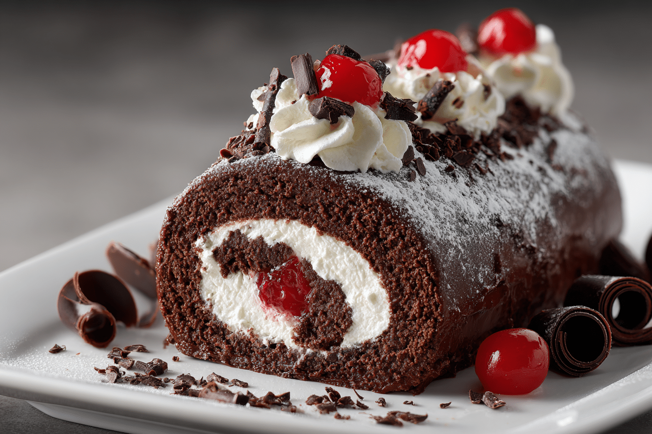 A sophisticated rolled version of the classic Black Forest cake featuring chocolate sponge, whipped cream, and a tart cherry filling — all spiraled into an elegant, sliceable dessert.