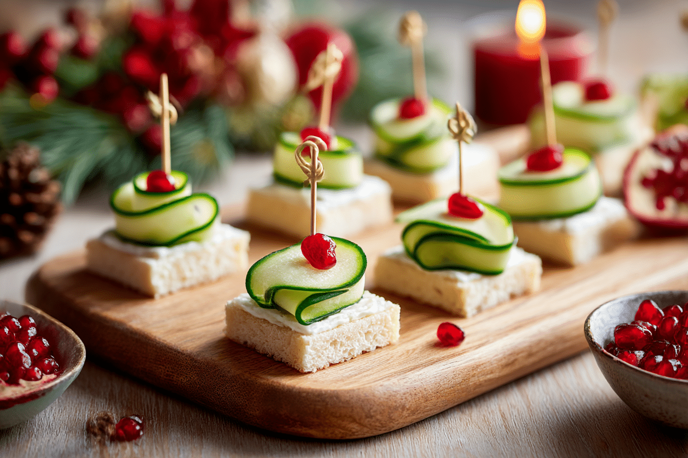 Substitutions are simple: any spread or cheese can be used based on preference, and vegetables can vary according to availability. The combination of bread, spreads, fillings, and garnishes creates both a visually appealing and delicious holiday treat.