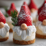 Shaped like charming little Christmas gnomes with fluffy white beards, red berry hats, and sweet cream cheese filling, these individual cheesecakes are the perfect blend of festive and flavorful. With a buttery cookie crust, a light and tangy no-bake filling, and easy edible decorations, they’re ideal for Christmas parties, cookie swaps, or even a kid-friendly holiday baking session.