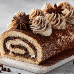 • Unroll cake. Brush with coffee syrup. Spread filling. Re-roll. Chill 1–2 hours.