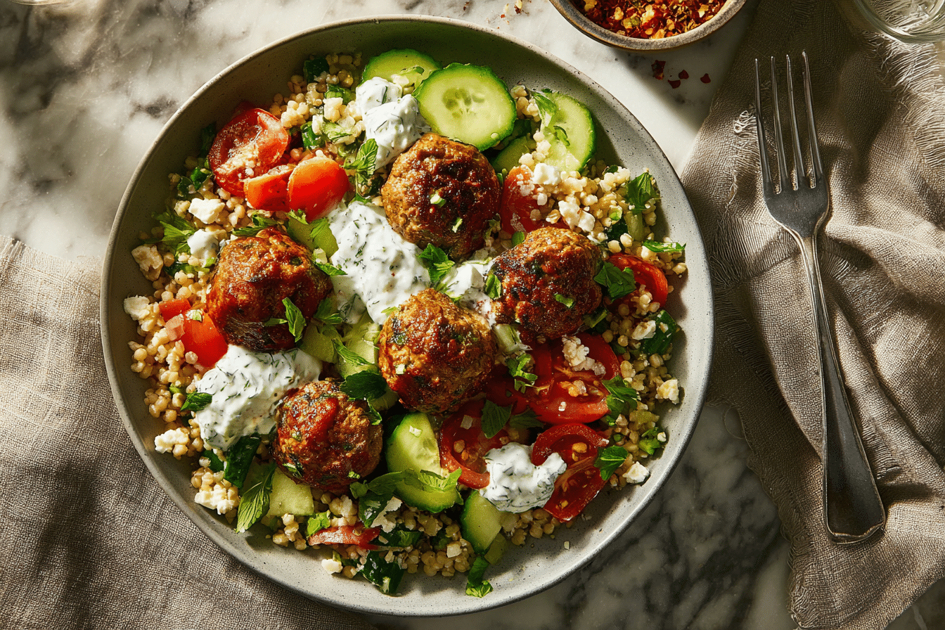 Greek Meatball Bowl Recipe brings together seasoned meatballs, grains, chopped vegetables, and a yogurt-based sauce in a single assembled meal. Each part is prepared separately, then combined at serving time. The result is a balanced plate with warm and cool elements in one bowl.