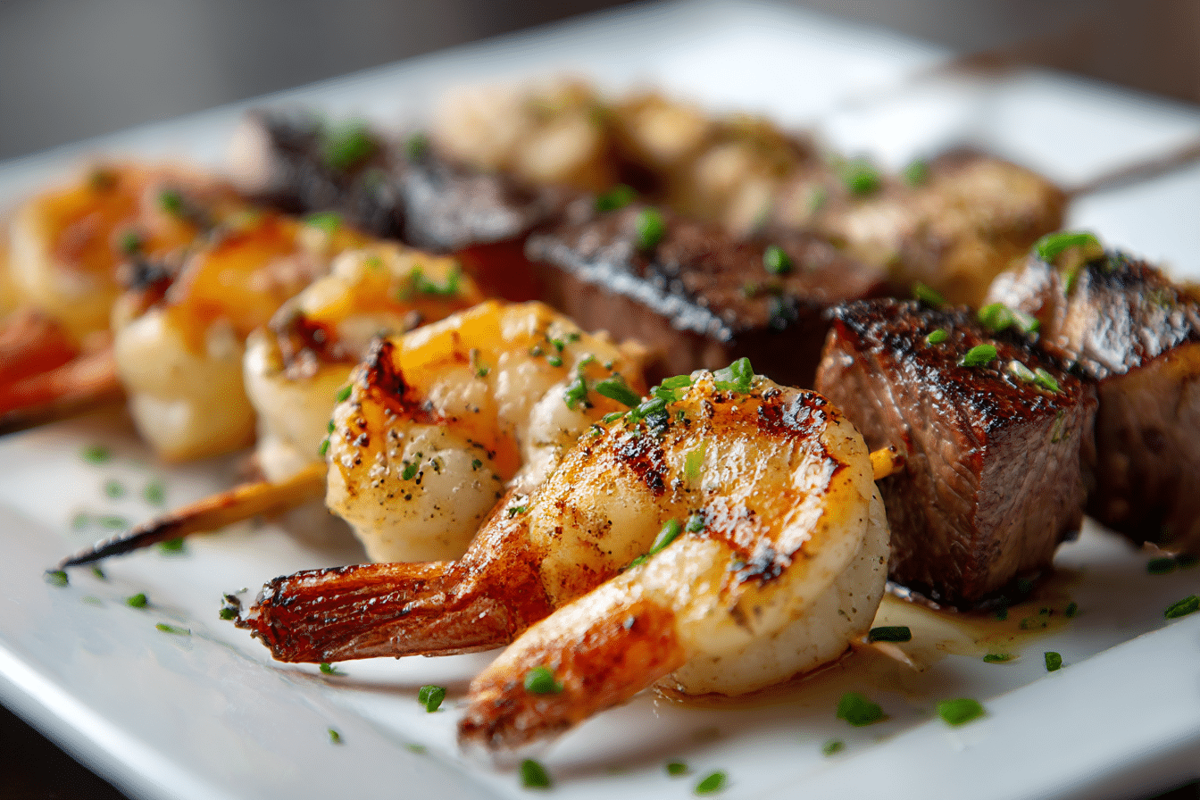 Delicious Grilled Steak and Shrimp Skewers with Garlic Butter Sauce bring together tender beef and juicy seafood in a single sizzling dish. Each skewer carries a balance of smoky char, rich marbling, and sweet brininess that turns an ordinary dinner into a memorable spread.