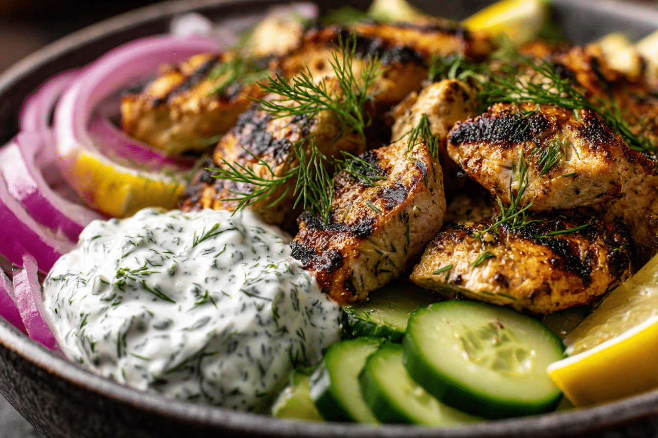 Chicken breast or chicken thighs serve as the main protein in this dish. Chicken breast provides a lean option, while thighs offer extra juiciness and deeper flavor. The chicken is marinated with lemon juice, olive oil, garlic, and dill to create the signature Mediterranean taste.