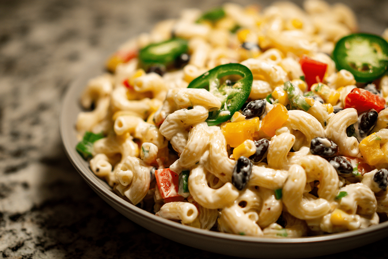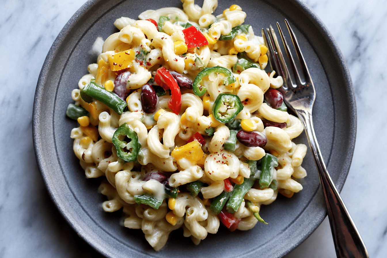 1. Cook macaroni until al dente, drain, and rinse. 2. Dice vegetables and drain beans. 3. Whisk together mayonnaise, sour cream, lime juice, and spices. 4. Combine pasta, vegetables, beans, and cheese. 5. Add dressing and stir gently. 6. Refrigerate 1–2 hours. 7. Garnish with cilantro and jalapeño if desired.