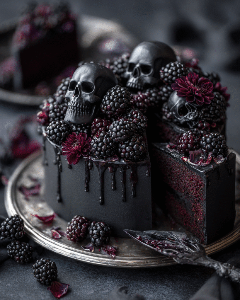 Elegant Halloween Dessert – Black Velvet Cake with Berries & Skulls