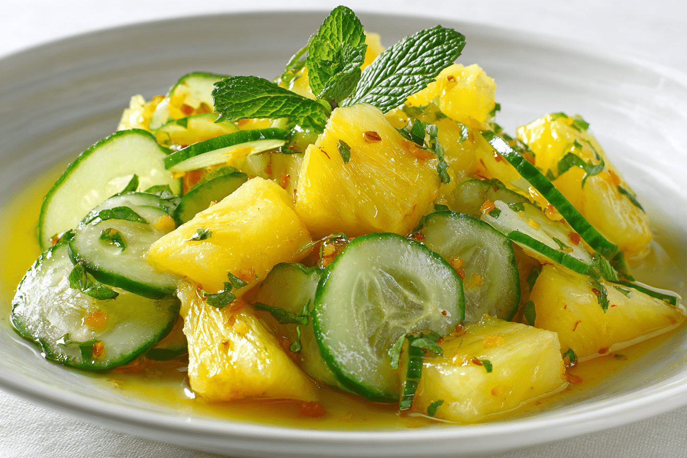 Pineapple Cucumber Salad pairs beautifully with grilled meats, seafood, tacos, or vegetarian dishes. Its light, refreshing character makes it perfect for summer barbecues, picnic lunches, or casual dinners.