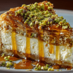 Baklava Pistachio Cheesecake is a dessert that speaks to both tradition and indulgence in the most unforgettable way. It combines the buttery crunch of classic baklava with the creamy richness of a velvety cheesecake, creating a dessert that feels both nostalgic and luxurious. The layers are dramatic: flaky phyllo soaked in syrup, luscious pistachio-studded cheesecake filling, and a crown of golden, crispy phyllo topping.