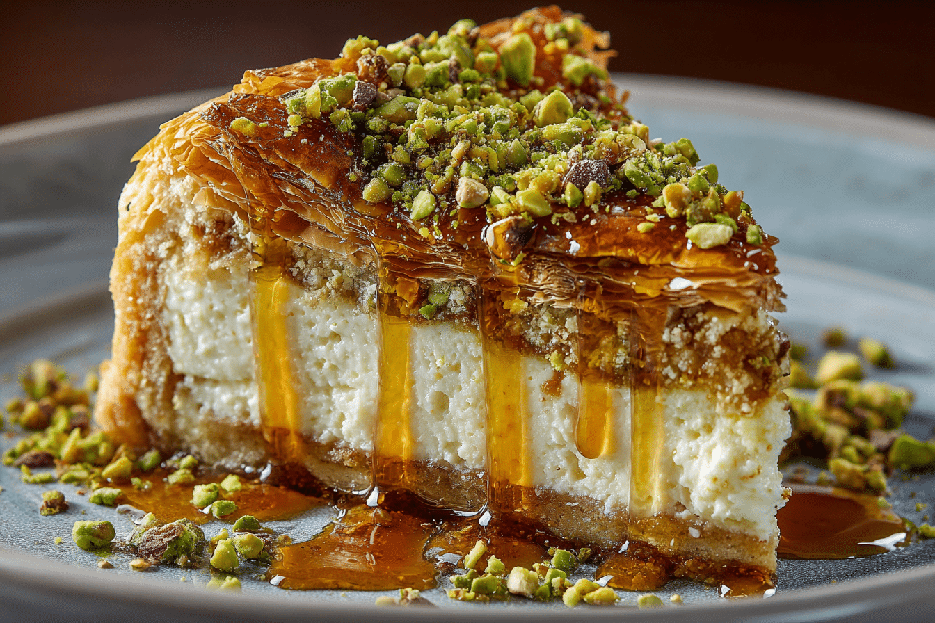 A rich and creamy cheesecake meets crispy, honey-soaked baklava in this indulgent pistachio dessert, perfect for special occasions.