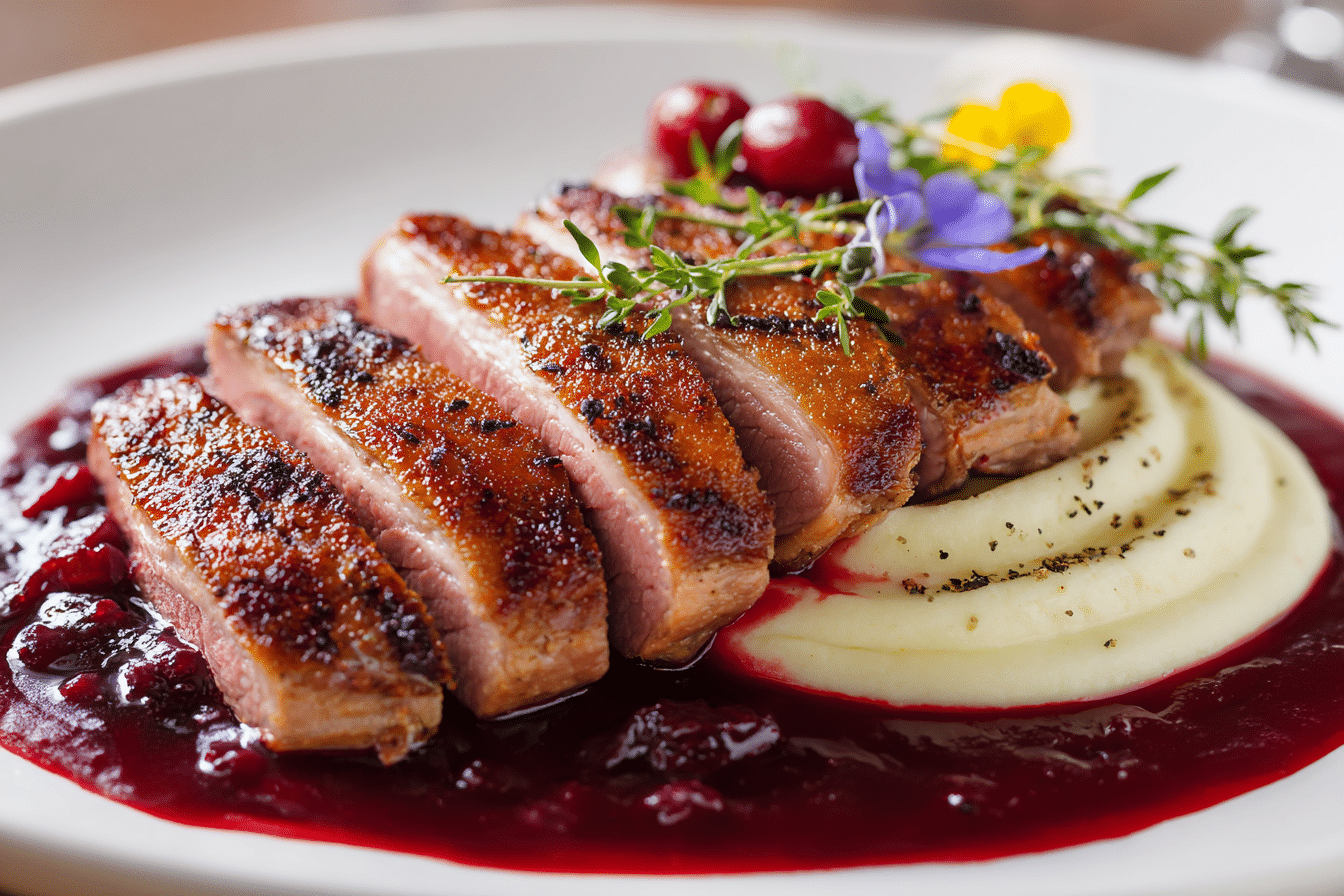 Crispy seared duck breast served with a luscious red wine cherry sauce — elegant, flavorful, and perfect for special occasions.