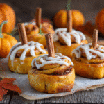 Soft cinnamon rolls shaped like pumpkins, finished with cream cheese frosting and a pecan stem — perfect for festive fall breakfasts.