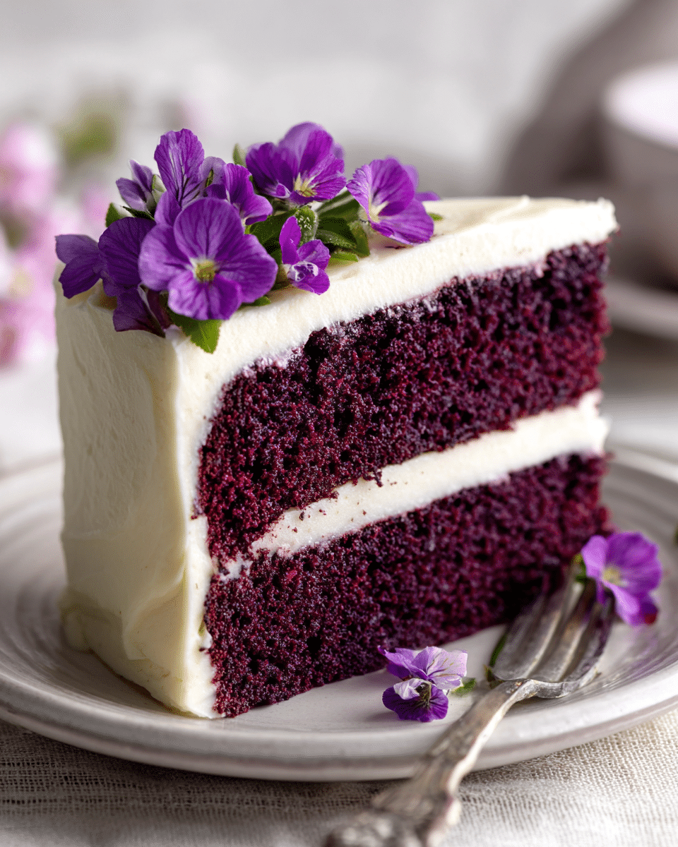 A rich and visually stunning purple velvet cake with soft layers, subtle cocoa notes, and luscious cream cheese or vanilla frosting—perfect for show-stopping celebrations.