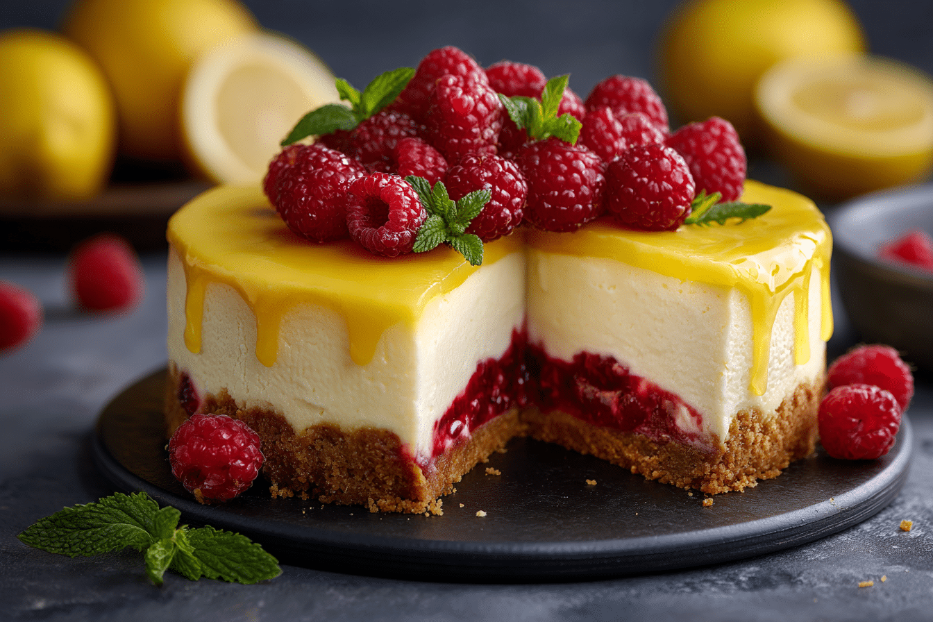 A creamy lemon cheesecake layered with vibrant raspberry sauce on a buttery graham cracker crust.