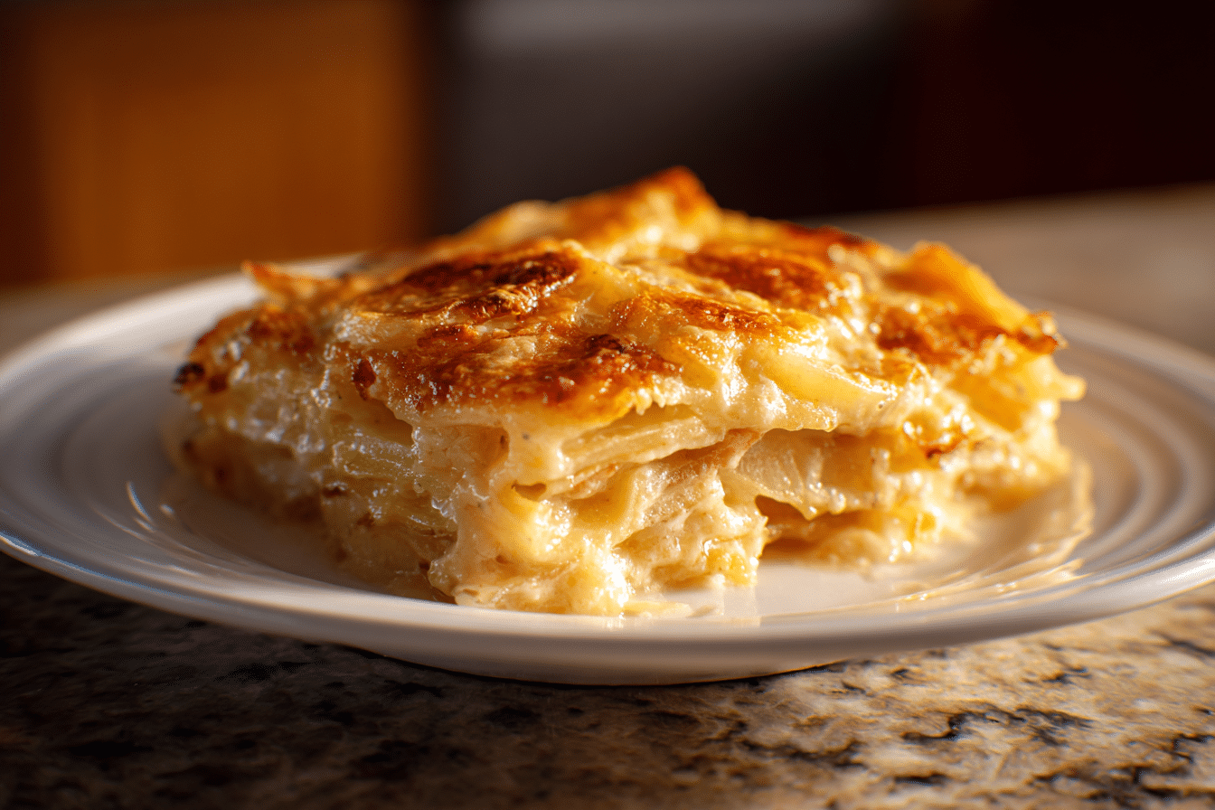 Cover with foil and bake for 35 minutes. Remove the foil and bake an additional 25–30 minutes until the potatoes are tender and the top is lightly browned. The edges should bubble gently, and a fork should slide through easily. Allow the casserole to rest for 10 minutes before serving so the sauce thickens and the flavors meld.