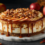 A luxurious layered cheesecake featuring a buttery graham cracker crust, creamy spiced filling, tender cinnamon apples, and homemade salted caramel. A showstopping dessert perfect for fall celebrations.