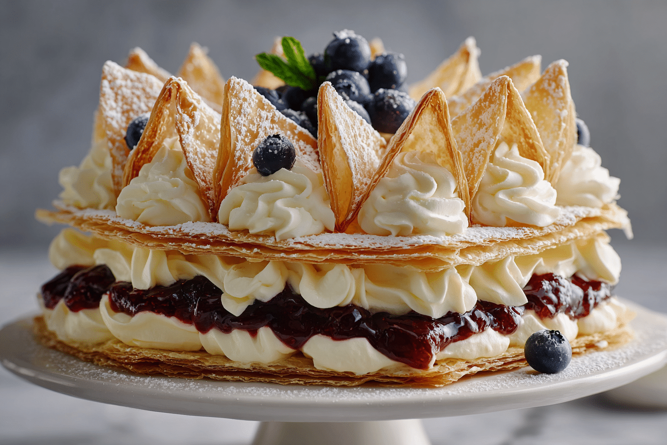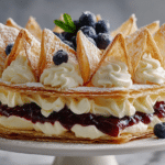 Whether you’re celebrating a birthday, serving Sunday brunch, or just craving something sweet and fresh, this cake delivers elegance and flavor in every bite. The buttery, flaky pastry contrasts beautifully with the airy whipped cream and the tart sweetness of mixed berries, creating a dessert that’s both light and indulgent.