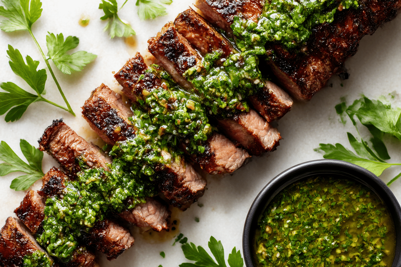 Serve the sliced steak topped with a generous spoonful of chimichurri. Add extra sauce on the side for dipping.