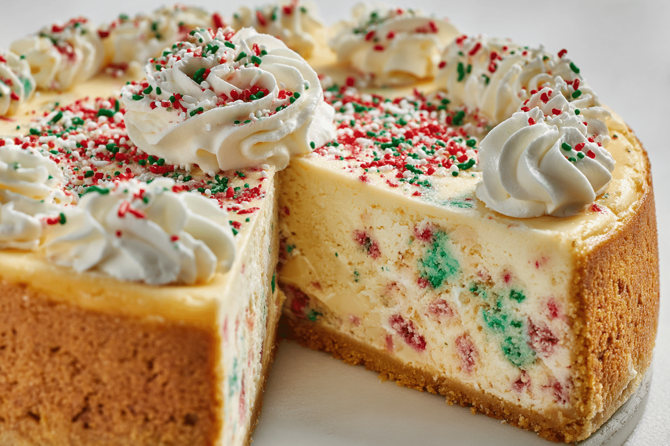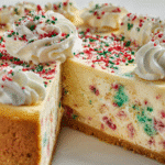 A rich, creamy cheesecake layered over a soft sugar cookie crust — the perfect festive dessert for holidays, parties, or cozy gatherings.