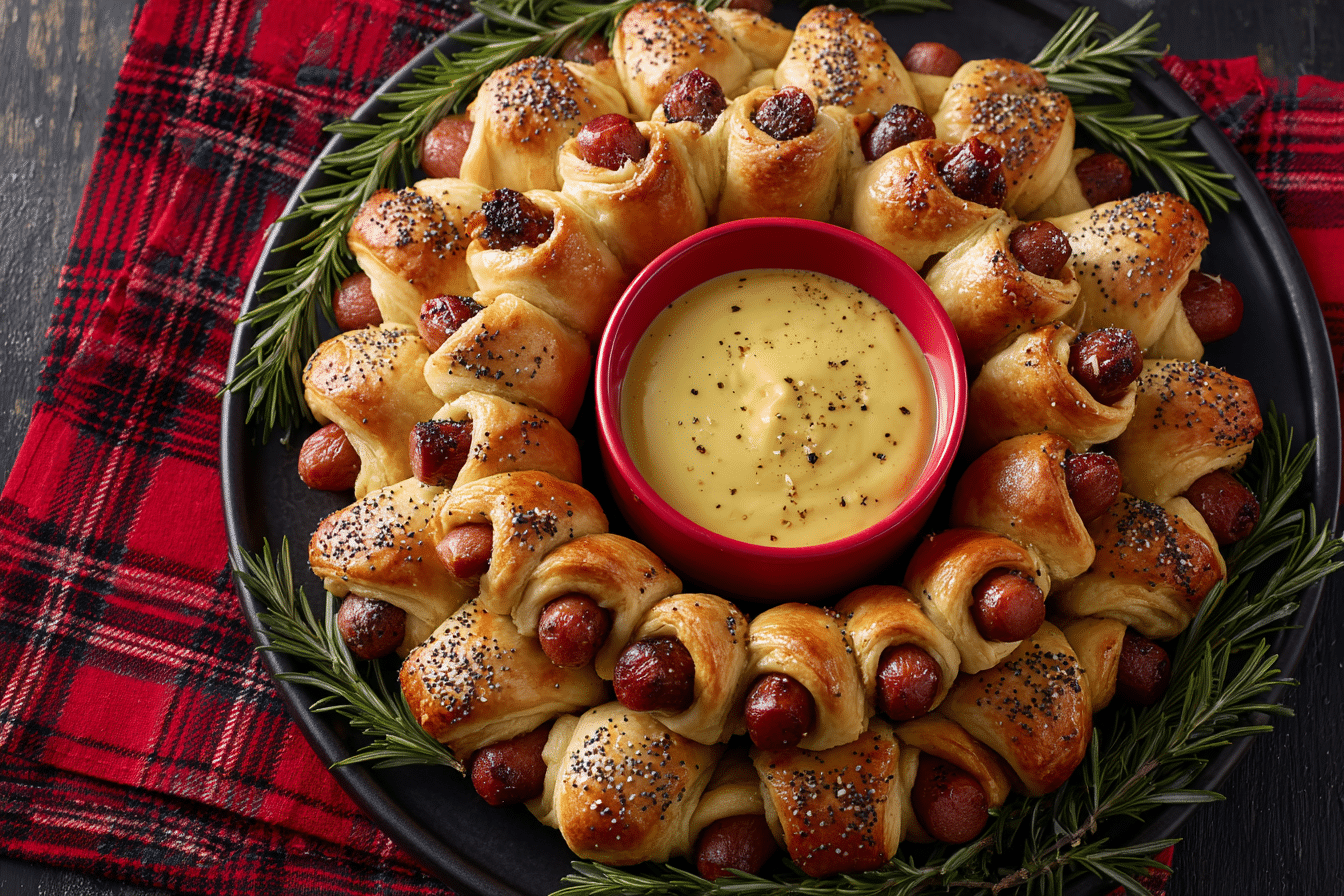 These holiday pigs in a blanket are a festive twist on a classic appetizer — buttery dough, smoky sausage, and a golden finish perfect for Christmas Eve.