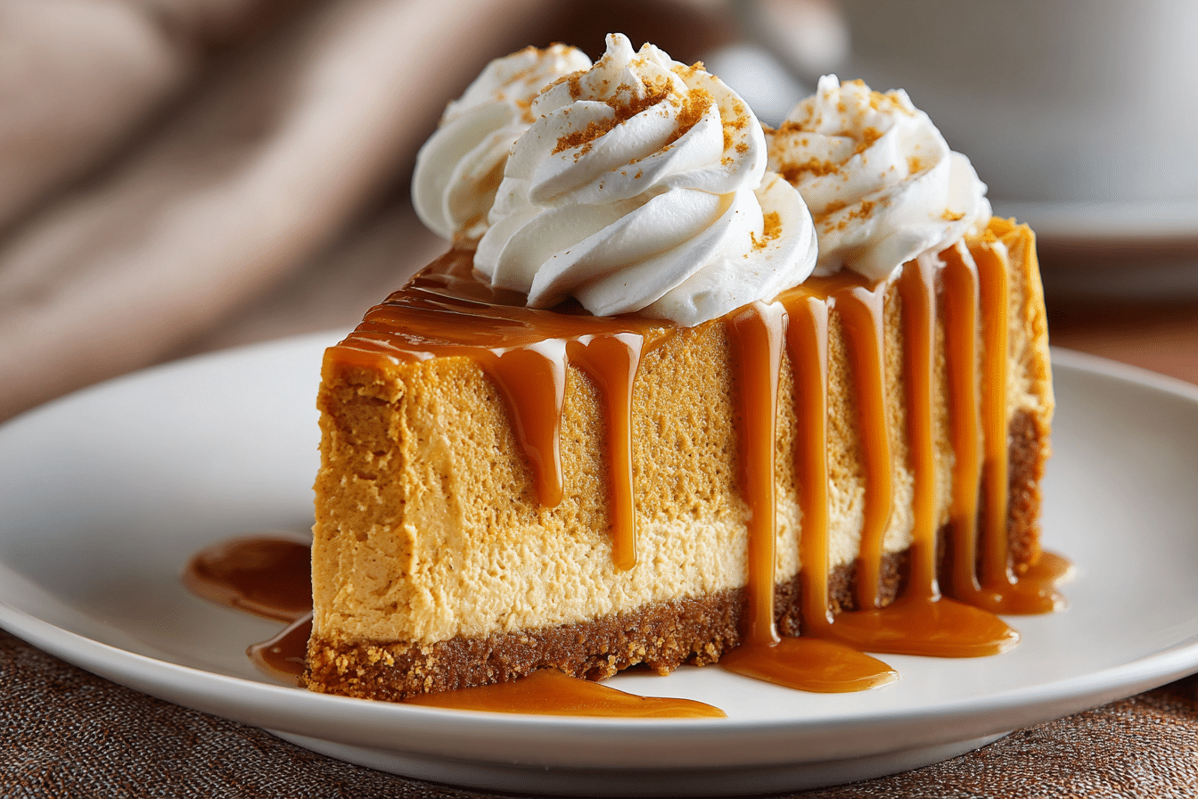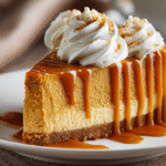 With a buttery graham cracker crust, warmly spiced pumpkin filling, and optional whipped cream topping, it’s the ultimate holiday centerpiece — ideal for Thanksgiving, Friendsgiving, or any fall celebration. The texture is denser than a pie but lighter than New York cheesecake, and the pumpkin flavor is beautifully balanced by cinnamon, nutmeg, and ginger.