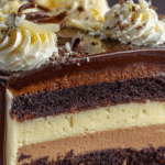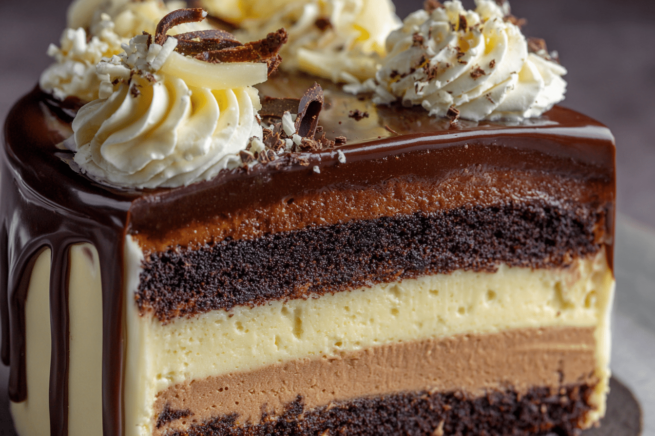 This Tuxedo Cake – also known as Triple Chocolate Mousse Cake – features layers of moist chocolate cake, silky dark chocolate mousse, fluffy white chocolate mousse, and a glossy ganache topping. A rich, stunning dessert for special occasions.