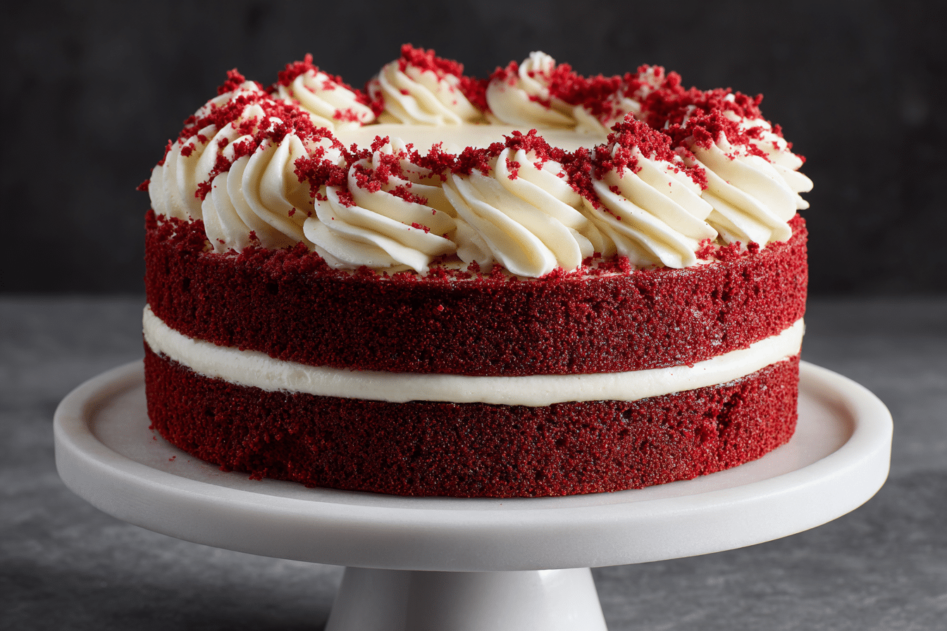 A classic red velvet cake with a moist, tender crumb, hint of cocoa, and tangy cream cheese frosting — perfect for celebrations.